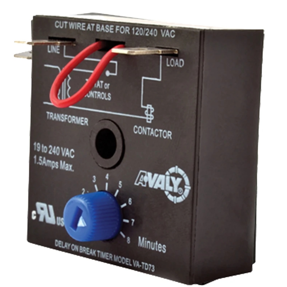 Dispositivo retardador (interruptor de horario) Delay on Break. Con tiempo ajustable. Ayuda a programar los períodos de arranque en sistemas de congelación y acondicionamiento de aire, para disminuir la carga instantánea.