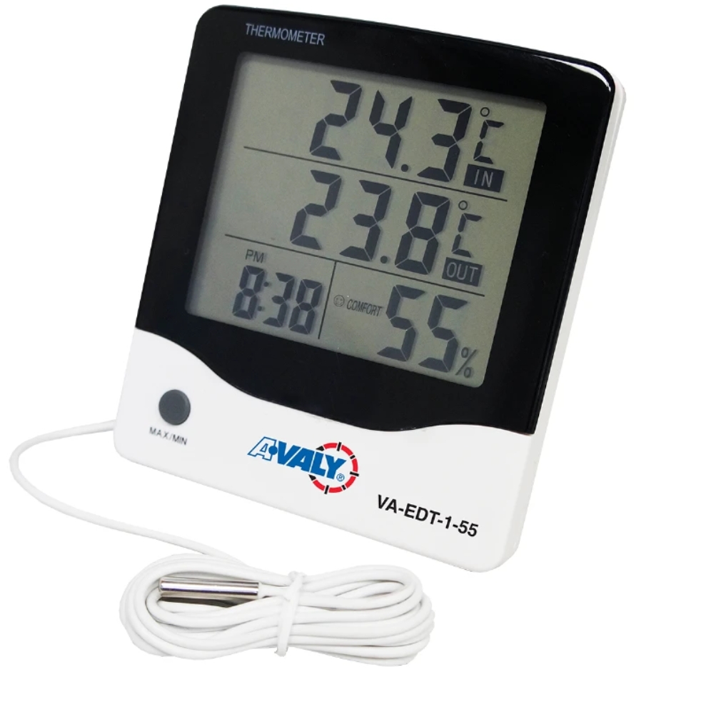 Este termómetro digital es un instrumento muy utilizado en las industrias y en muchas actividades relacionadas con el análisis técnico-científico. Está conformado por una cadena termométrica compuesta por una sonda de temperatura con un sensor resistente al agua y el sol, siendo este mismo de longitud de 2.00 m, al igual que un indicador digital. Emplea dos formas de instalación: en pared y soporte para mesa. En cuanto a su exactitud y precisión es de excelente calidad. Es recomendable que la calibración de termómetros digitales sea realizada por laboratorios de calibración acreditados. Ofrece 1 año de garantía.