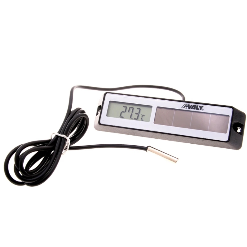 Termómetro solar de bulbo, para vitrina, funciona por medio de energía solar mediante una placa y una batería de AAA de 1.5 Volts que le permite funcionar día y noche con botón de encendido y apagado. Recoge datos atmosféricos para registro de temperatura, tendencia de los sucesivos días y los valores mínimos y máximos. Contiene escala intercambiable de ºC /ºF y un cable sensor de acero inoxidable de 1.20 m para registrar temperaturas en cuartos de refrigeración.