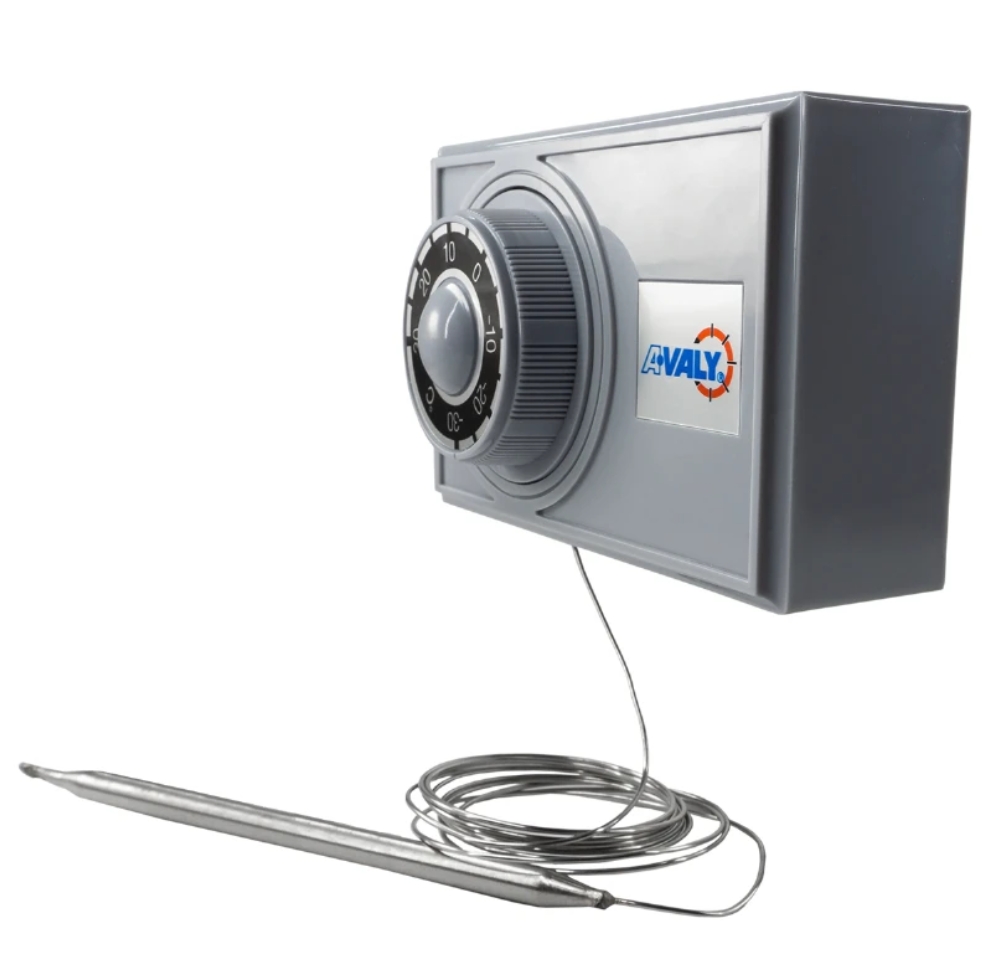 Dispositivo que permite controlar los sistemas de calefacción y refrigeración para mantener una temperatura determinada dentro de ciertos rangos. El termostato puede mantener la temperatura baja o alta dependiendo del nivel deseado. Este tipo de dispositivo utiliza mecanismos físicos, para medir la temperatura del aire, activar los procesos que van a encenderla y apagar el sistema. En este se efectúan diversos sensores tecnológicos, desde tiras bimetálicas, bolitas de cera, bulbos y tubos de aire. Estos sensores reaccionan de acuerdo con los cambios en la temperatura y mediante expansión o contracción, activan los interruptores para subir o bajar la temperatura.